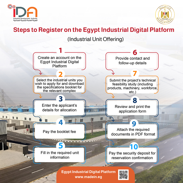 The application process is fully digitized through the Egypt Digital Industrial Platform to ensure transparency and speed. Investors should navigate to the "Industrial Units Offering" section and follow these simplified steps: